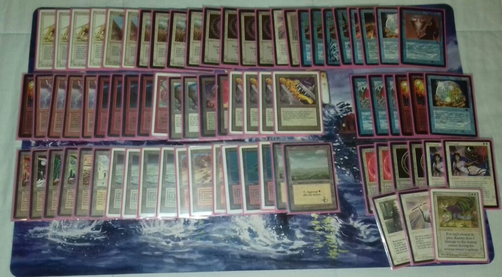 I really wanted to play Swaffel. For those who don’t know, it’s Swedish B&R + Fallen Empires, with Hymn restricted. So just one Strip Mine, one Mishra’s Workshop, and no mana burn. I think Fallen Empires is great to add some cards to the card pool every once in a while. I opted for different decks, but each time I was drawn to Orggg.dec. I played it back in 2020 in my first ever Atlantic tournament organized by DFB during the COVID pandemic. It’s a deck played by Mano, which he improved in his podcast. I used all of his comments back then and played it to a 5-2 finish, but above all, had loads of fun playing Orgg. If you don’t know, it’s 3RR for a 6/6 trample, which can’t attack if the defending player controls an untapped creature with power 3 or greater, and also can’t block creatures with power 3 or greater. I expected fewer UWx decks in Swaffel because people like to play something different. I expected more Orders, Goblins, and other small stuff. And I really wanted to play Orgg, but I already said that. So, instead of three last time, I added one. I also added one Atog and removed two Icy Manipulators. All in!