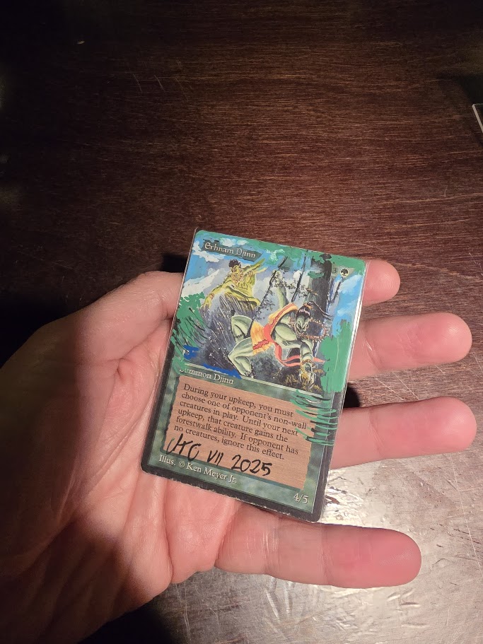 I built a new Ante deck: Titania’s Song. It’s one of my pet decks, and since Ante games are slower, I wanted to see how it does. Tower, Tax, Winter Orb, Icy, Relic Barrier, and The Abyss, you get the drill. After getting my Land Tax active, I searched for the Forest, which I need for my wincon. I searched once, twice, three times… Where is it? Did I forget to put it in my deck? Nope… It’s in my Ante. Oops, I forgot that was even a possibility. I just have Factories now for a potential win, but Rob plays Plows and Disenchants, so I can’t use them till he’s in a total lock. Rob plays Bird to save his Ante, another Bird, and then plays City in a Bottle. I’m not worried about losing a Forest, but still… I got my Tower active. Rob hopelessly played Contract from Below to draw a new hand, with an active LoA as well, but went nowhere. With City in play, he couldn’t save his new Ante card with a Bird. With the Contract and active LoA, he was decking himself. He Disenchanted the City in a Bottle to play Bird, which I Disenchanted on activation. I did the same with his last Bird, so we’d have something to win… I love Ante. Just a Shatter, but the game was on! I switched to playing Gwen, who plays with power in Ante. I won the first 2 games, not bad, but just Birds. He won game 3, taking an Erhnam Djinn. Darn! I asked Jurriaan to alter it, because I’m terrible at it. Not bad, I’d say!