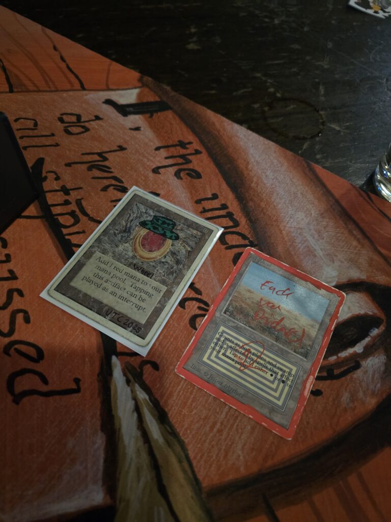 Then things got really crazy. Rob jammed some games against Gwen, and Gwen got to save his Sapphire, good save! But the next time, he wasn’t so lucky. Rob won against Gwen, and a Mox Sapphire was flipped over. It’s what you put at risk, obviously, but when it happens, it does hit a little different. Gwen took it well and got to do his first alter on a Mox, that’s also a new experience. I was told that up till then, a Mishra’s Workshop was the biggest win in Ante40k. Well, it’s hard to top a Mox Sapphire! I got to play another two rounds, and after drinking too much beer, I went to bed, skipping the night out in town. One of the better decisions of the weekend.